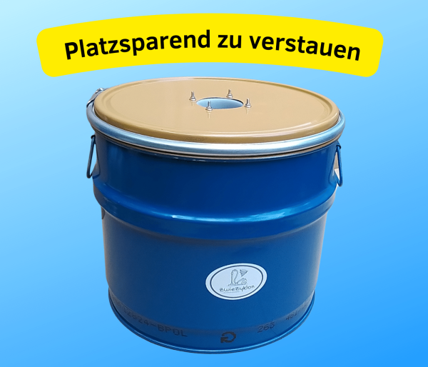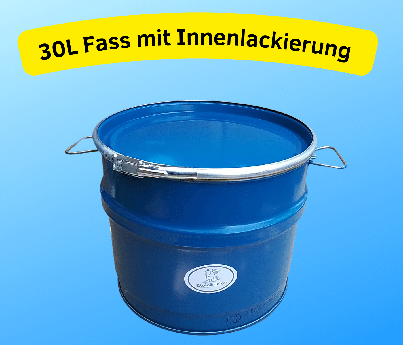 Robustes 30 Liter Stahlfass mit stabiler Sicke im oberen Bereich für guten Halt und praktischen Griffen zum Transport.
